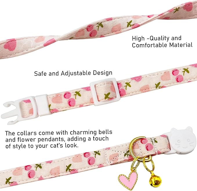 2 Pack Cotton Breakaway Cat Collars Set with Bell and Flower Pendant, Cute Floral Fruit Patterned, Adjustable 7.5-11Inch, Include A Mouse Toy Gift (Heart Cherry)