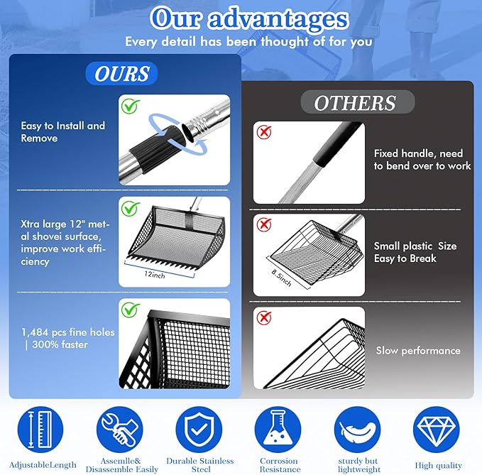 - Large-Capacity Metal Chicken Poop Scooper : Constructed with a heavy-duty metal shovel head and rake, paired with a 304 stainless steel handle and an adjustable soft rubber grip, it is suitable for use year-round. The metal-toothed chicken manure shovel head measures 12 inches in width, with a curved groove design significantly increasing the shovel's capacity, enabling it to scoop and sift waste in a single pass, greatly enhancing work efficiency.