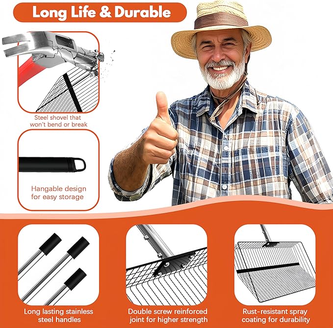 - Multi-Purpose Screening Shovel: Chicken scooper for poop crafted with high-quality stainless steel, this extra-wide shovel handles large-scale coop cleaning while reducing repetitive motions. Easily convert it for sifting leaves, beach sand, horse manure, or cattle pens