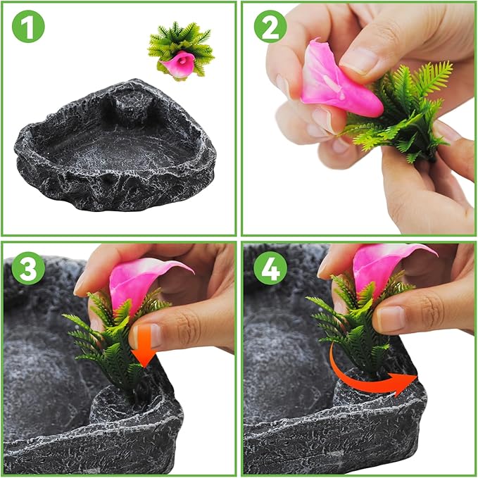 - Reptile Breeding Plates Horns And Bowls: Artificial plant reptile water bowl terrariums.The little ones will be curious in front of a gift. Their little PAWS will cling to the clear water and sway slightly, reflecting their curious reflections. They will probe their heads to observe the ripples in the water bowl, and their tongues will quickly touch the water as if they were savoring the most precious nectar. When they look content, this gift is present on every Christmas, Thanksgiving, Halloween, Valentine's Day, New Year's Day, Easter, birthday and other festivals. It is a perfect gift for reptile owners, breeders and enthusiasts