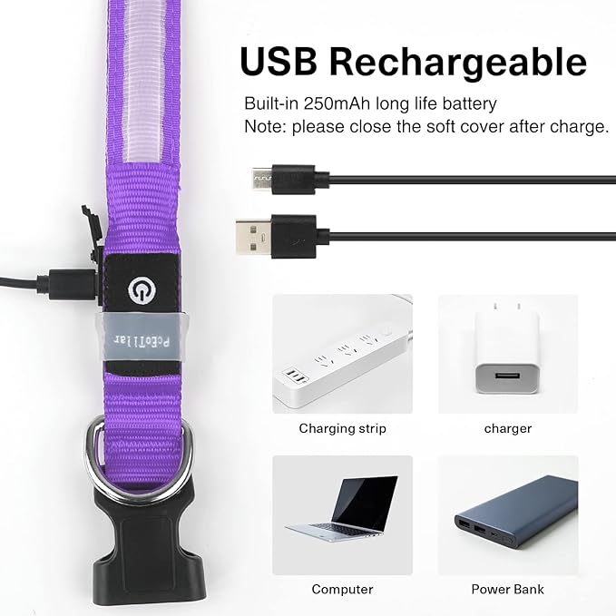 - Rechargeable Led Dog Collar: PcEoTllar dog collar is waterproof. No worries about the collar when your dog is swimming or playing under the water! Please close the Soft Charging Cover after charging and please stay away from sea-water. Rechargeable with any other daily USB device is more convenient, you will not paying for batteries anymore! Full power can last 10 hours.