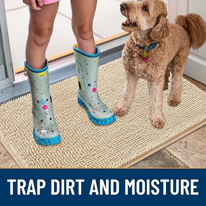 Smiry Dog Door Mat for Muddy Paws 30x17, Absorbs Moisture and Dirt Doormat, Non-Slip Washable Quick Dry Chenille Front Door Mat Indoor Entrance, Entryway Carpet for Inside Floor, Beige