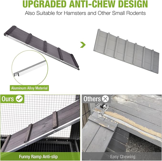 - ANTI-CHEWING ALUMINUM ALLOY FRAME: Ramp edges and the curved door frame are reinforced with durable aluminum alloy to resist chewing damage. This upgraded framing extends the rabbit cage lifespan while protecting against small animal gnawing.