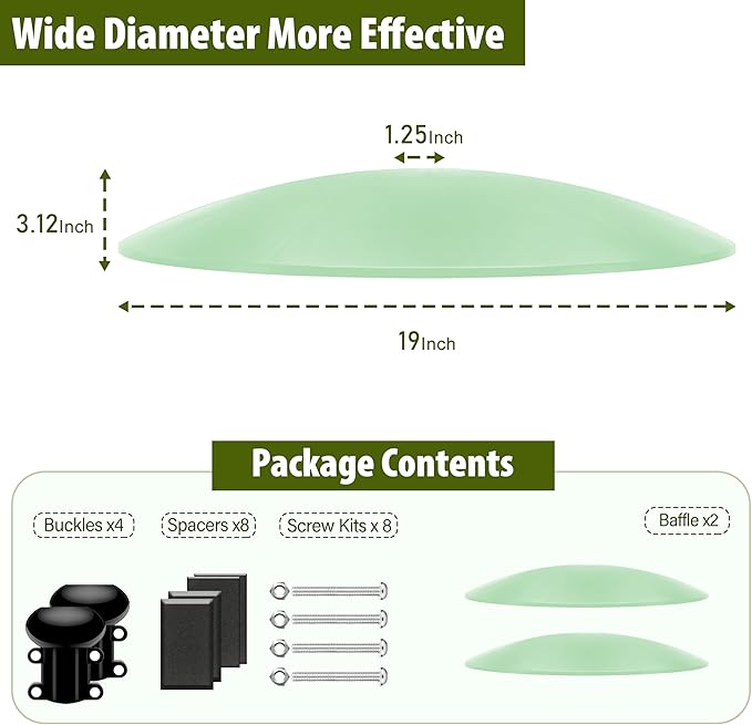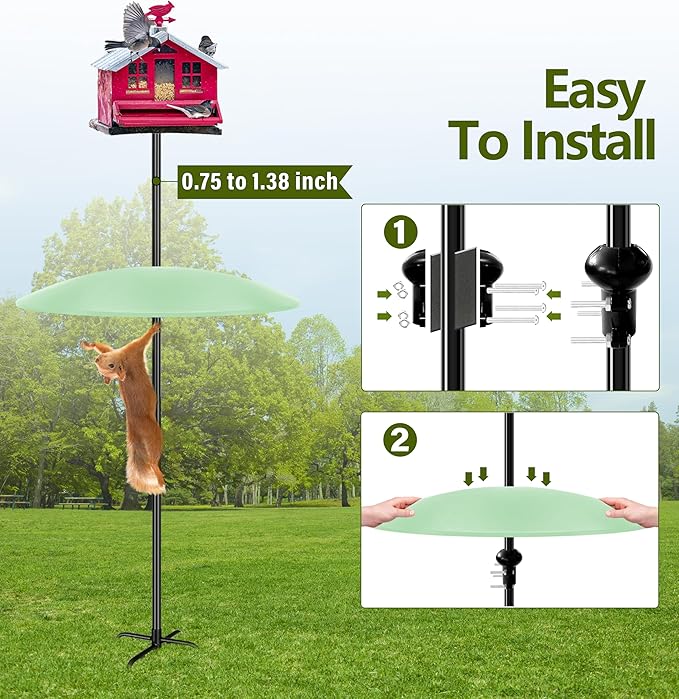 - 【19-inch oversized feeder protection banner】 After conducting research, we discovered that intelligent squirrels can bypass baffles with a smaller diameter. To make it more difficult for them to steal food, we increased the baffle's diameter to 19 inches. Typically, adult squirrels have an arm span of only 11–15 inches, so even if they spread their arms, they won't be able to reach the edge. Stop squirrels in their tracks and make your backyard safer!