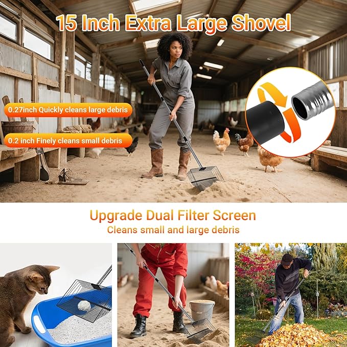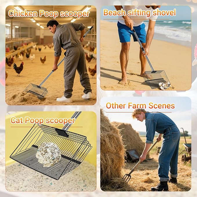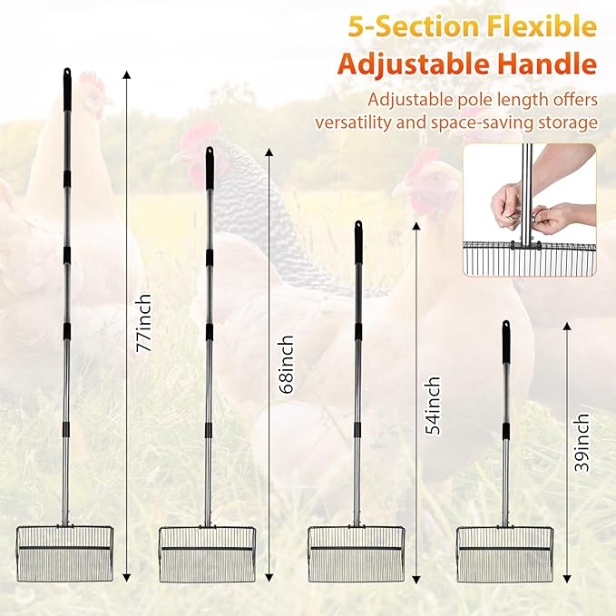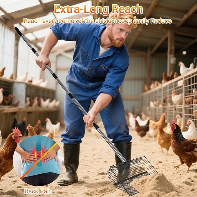 - 【Adjustable Long Handle (39"-77") - No Bending Required】 The long handle extends from 39" to 77", making it perfect for chicken coop accessories cleaning. Reach every corner of cages or chicken run effortlessly. Great for dog pooper scooper and cat litter scoop too!