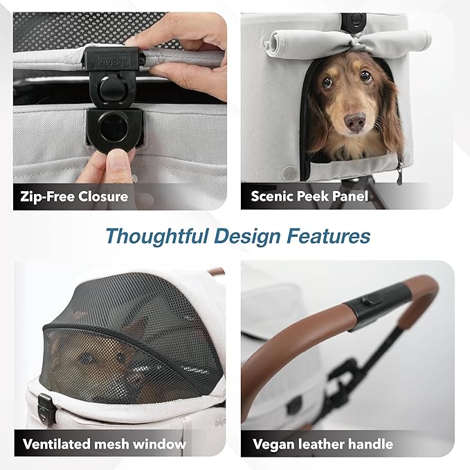 - Need Extra Comfort and Storage? A vegan leather handle adds grip comfort, while the under-basket holds toys, treats, a pet stroller pad, or a pet stroller fan, perfect for longer outings.
