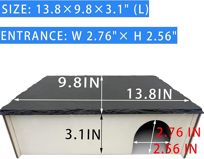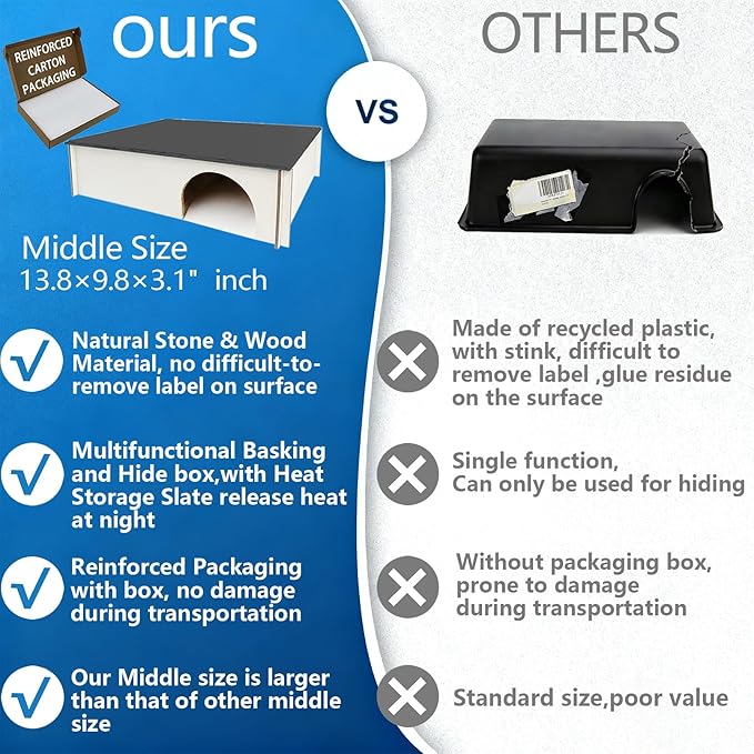 - 【Larger Humid Hide】Size:13.8×9.8×3.1" (L). Entrance: W 2.76"× H 2.56". Our smallest reptile hides is larger than that of others smallest size.Same price but larger size.