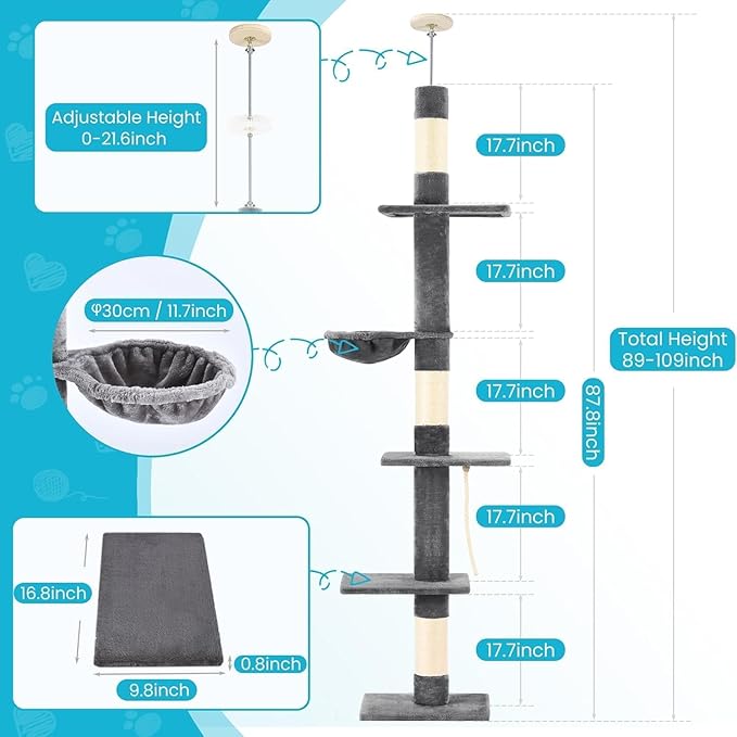 - Dimension: The main body of the cat tree is 87.8in high, and can be adapted to the ceiling of 89-109 in through splicing and adjustable screw rods. By utilizing the vertical space from floor to ceiling, this cat tree design optimizes space utilization. It's a great solution for cat owners who want to provide their cats with vertical enrichment while minimizing clutter.
