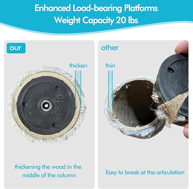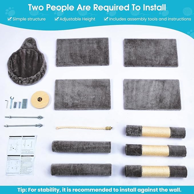 - Sturdiness and Stability: When installing, press down the main body of the cat tree as hard as you can, then rotate the rod up to the maximum length to withstand the ceiling and lock it until the cat tree no longer shakes.