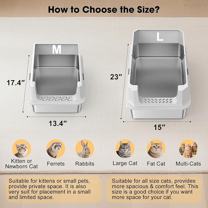 - 【Easy to Clean & Non-Stick】The kitten litter box features a non-stick, rust-proof surface that is easy to clean. Simply rinse with water to effortlessly wash away waste. Unlike traditional plastic litter boxes, this stainless steel cat litter box smooth surface that is comfortable for your cat and does not retain residue or odors, helping to keep indoor air fresh. It provides a clean and healthy place for your cat to live comfortably.