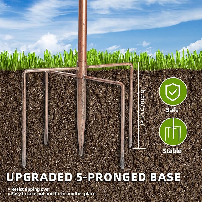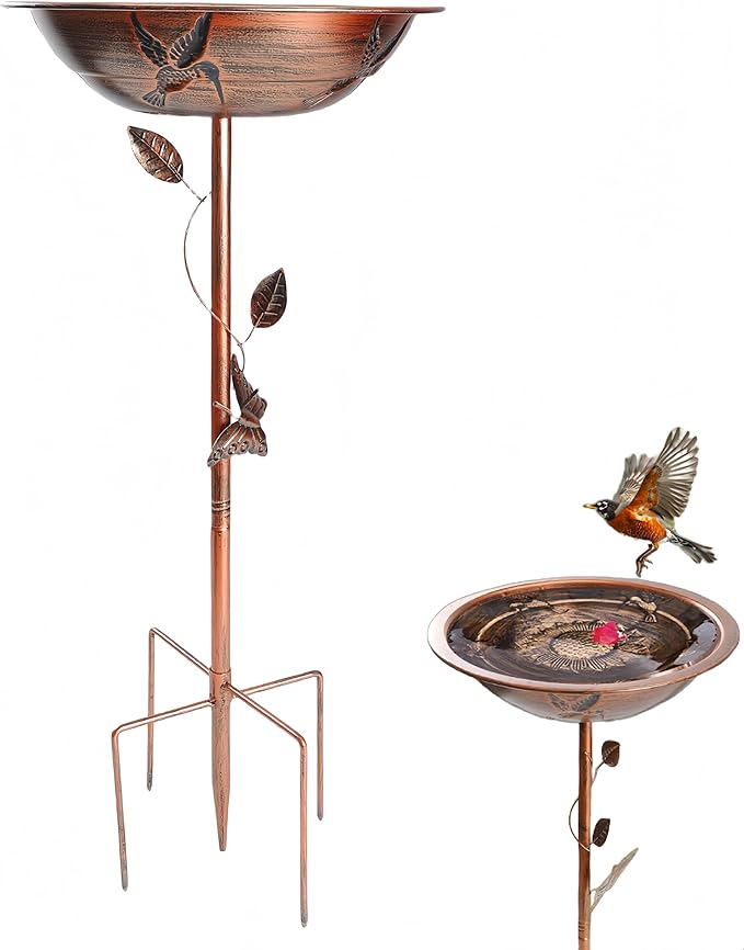 - Metal Material:This standing bird feeder is made of all-metal material and coated with a safety protection layer which can durability to avoid rusting. Metal stand and 5-pronged base stakes can support the bird bath bowl well.Strong load-bearing capacity, more sturdy and rain-wind resistant. The birds can safely roost, take bath, drink water and eat food here, which will be a beautiful landscape in your garden