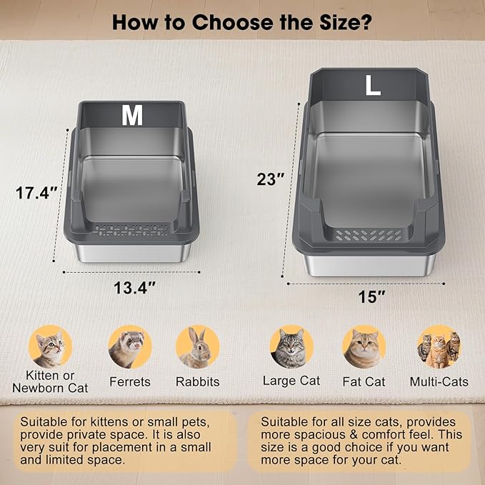- 【Easy to Clean & Non-Stick】The stainless steel litter box features a non-stick, rust-proof surface that is easy to clean. Simply rinse with water to effortlessly wash away waste. Unlike traditional plastic litter boxes, this stainless steel cat litter box smooth surface that is comfortable for your cat and does not retain residue or odors, helping to keep indoor air fresh. It provides a clean and healthy place for your cat to live comfortably.