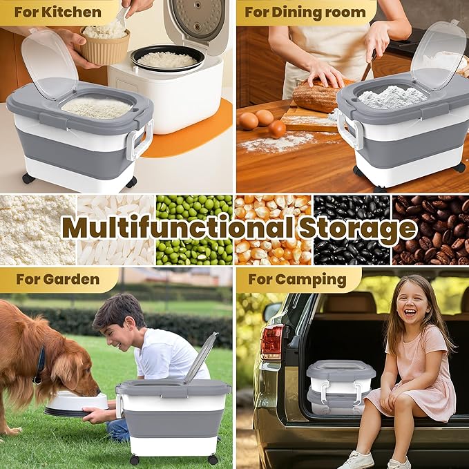 HOYTAMDA 20-30Lbs Rice Container,Collapsible Airtight Food Storage Containers with Wheels,Handle,Rice Storage Container with Small Bin and Scoop,Rice Dispenser for Flour Sugar Cereal Grain Dog Cat