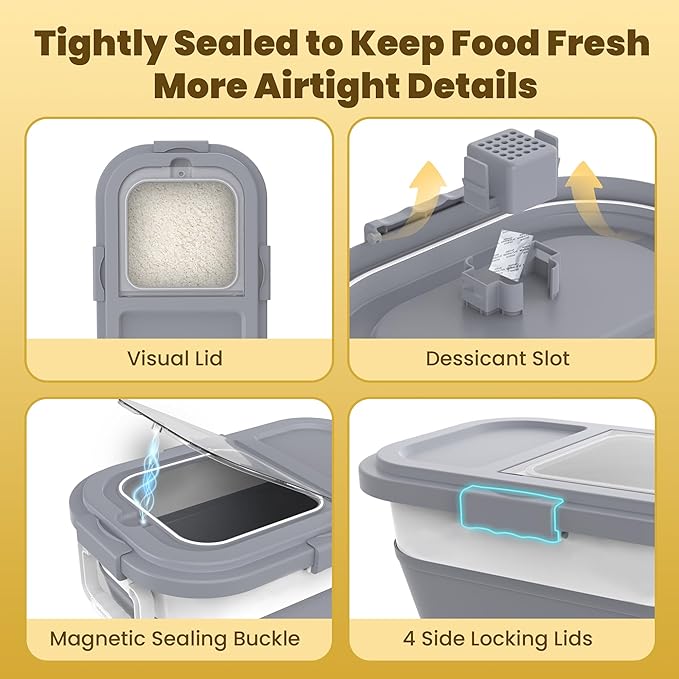 HOYTAMDA 25-35Lbs Rice Container,Collapsible Airtight Food Storage Containers with Wheels,Handle,Rice Storage Container with Small Bin and Scoop,Rice Dispenser for Flour Sugar Cereal Grain Dog Cat