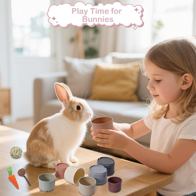 - Engaging Colorful Toys: Includes 8 pcs stacking cups and 3 pcs rabbit toys, these items provide a diverse range of play opportunities, catering to the naturally inquisitive nature of rabbits. It effectively combats boredom, allowing your bunny to engage in stimulating activities and reducing anxiety and destructive behaviors.