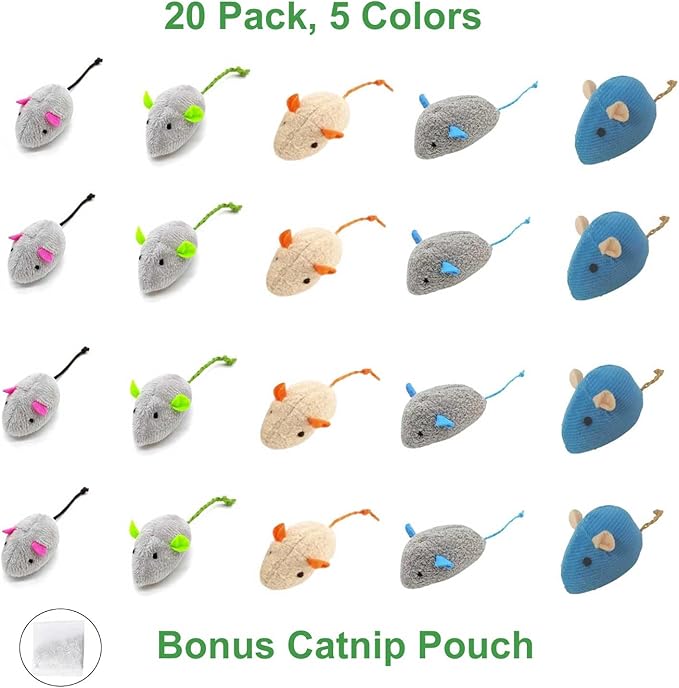 - 20 Catnip Mice Toys in Fun Colors: This value pack includes 20 pcs catnip-smell mice toys in 5 beautiful colors (4 of each), designed to attract your cat's attention and stimulate play. A perfect catnip toy set for kittens and adult cats alike