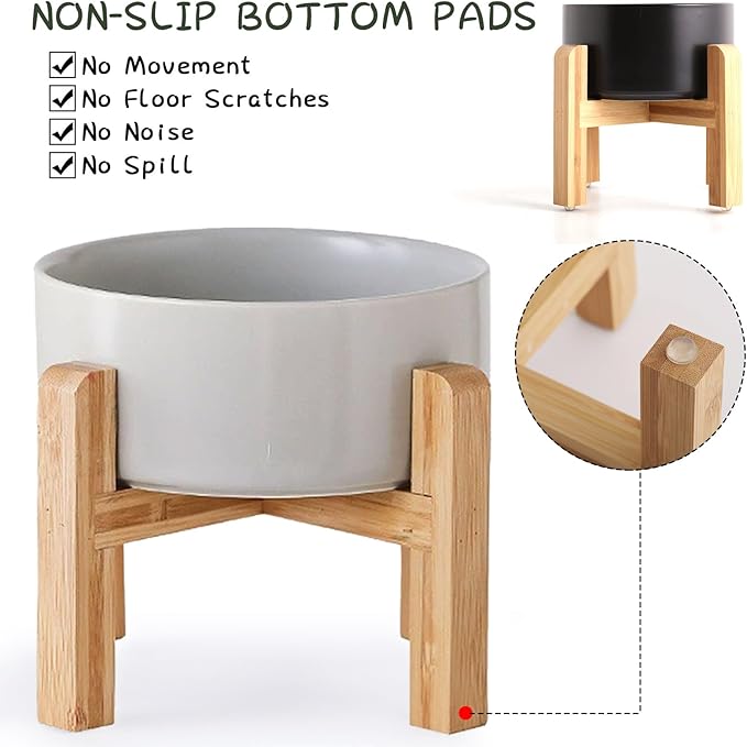 - NON SLIP WOOD STAND -You can get two different heights by flipping the bamboo stand,the elevated cat bowls are perfect for cats and small size dogs from different stages of childhood to adulthood, The wood stand on the bowls stopping ceramic cat dog bowl from sliding around, Keeps pet food and water in the bowls.