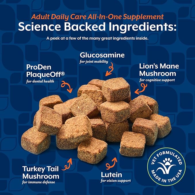 - All-In-One Daily Care: Our daily care soft chews for adult dogs help support mobility, gut health, immune function, longevity, cognitive function, skin & coat, dental health, emotional support, allergy defense, and eye health