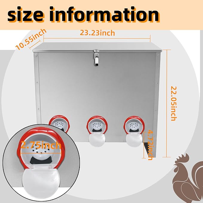 - 【Animal-Proof Design】: The latch at the top ensures that the lid fits tightly with the box.Prevent animals such as mice,weasels,and raccoons from stealing your feed,the feeding port's lid can also be closed at will,giving you more peace of mind