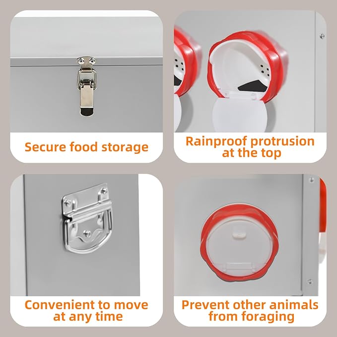 - 【Animal-Proof Design】: The latch at the top ensures that the lid fits tightly with the box.Prevent animals such as mice,weasels,and raccoons from stealing your feed,the feeding port's lid can also be closed at will,giving you more peace of mind