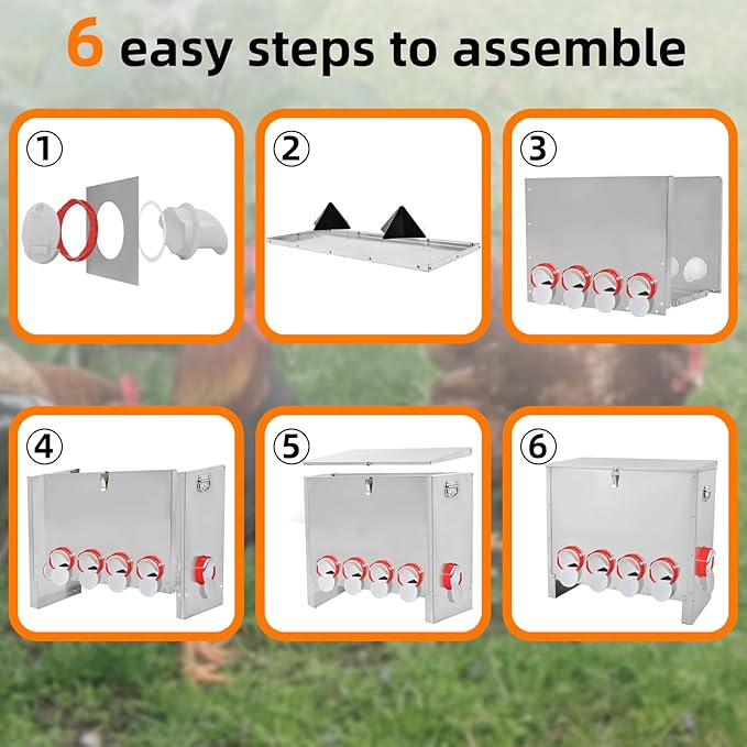 - 【Feed with No Waste】: Designed specifically to reduce waste,the feeding port is designed with a bafflea,which effectively blocks splattered feed while the chickens are eating,minimizing feed waste.The extended cover can prevent rainwater from wetting the feed,ensuring the feed remains dry and uncontaminated