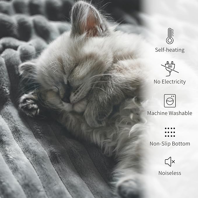 - 【No Electric Needed & Lightweight】This non-electric self-warming pad adapts to your pet’s body heat, delivering gentle warmth without any risk of overheating. Meanwhile its non-electric and lightweight design are perfect for travel or home——Whether you pack it in a suitcase for your furry friend's trip, or casually place it on the sofa or cat bed to switch scenes, it ensures warmth is always there.