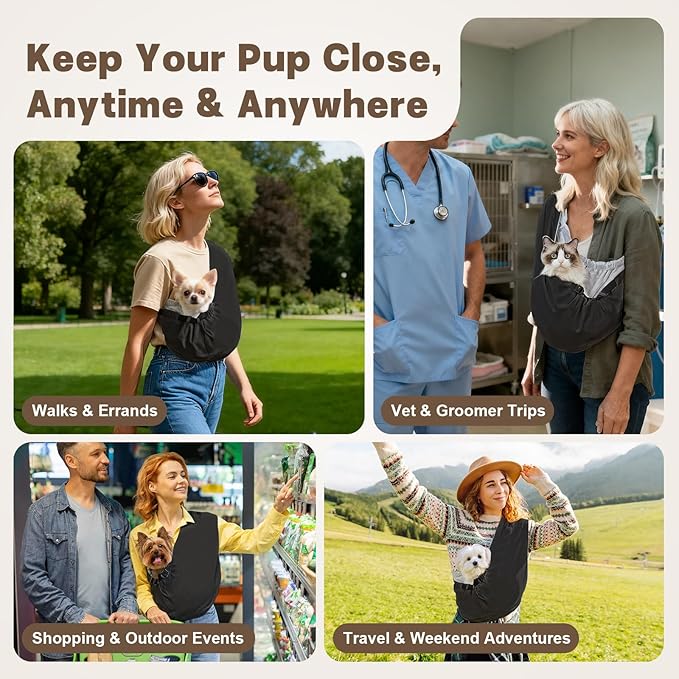 - [HANDS-FREE CONVENIENCE FOR ANY OUTING]: Free your hands while keeping your furry baby close. This puppy carrier sling is perfect for walks, grocery runs, public transit, vet visits, or weekend shopping. It’s a reliable pet sling carrier for small dogs that blends comfort, style, and daily practicality