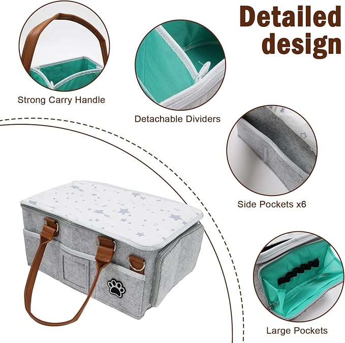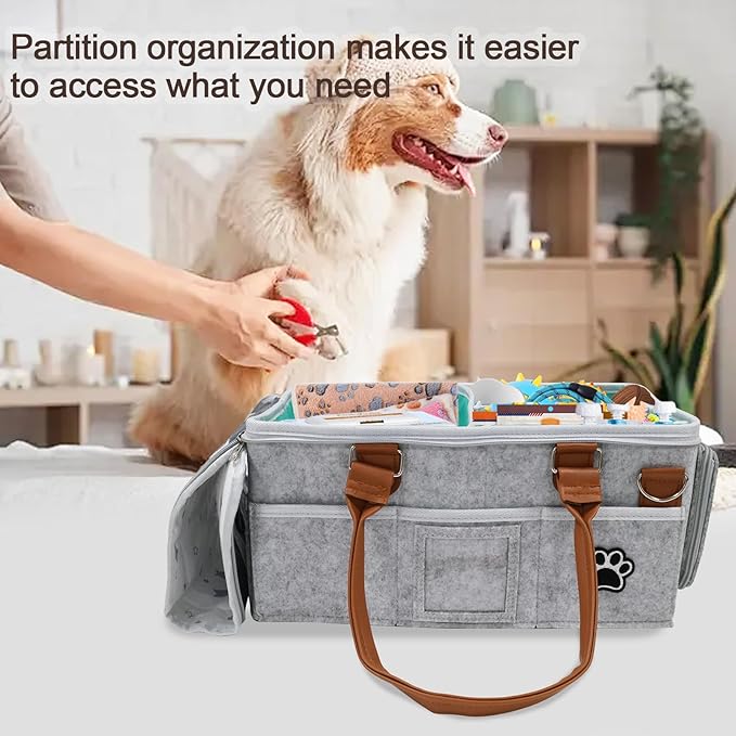 - 【DIMENSION】 Stores every grooming essential: shears, combs, flea combs, towels, diapers, blankets, pads, clippers, sprays & more in a compact 15”x10”x7” footprint.Our Felt Pet Grooming Organizer Bag is the ultimate solution for keeping all your pet care essentials neatly organized and within reach.