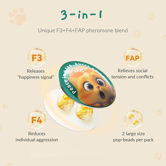 - Triple-Pheromone Formula (F3+F4+FAP) – Our POP Patch uses a scientifically advanced blend of F3 for environmental reassurance, F4 for social bonding, and FAP for maternal comfort. Together, they help calm cats during stressful events such as traveling, vet visits, loud noises, new environments, or multi-cat conflicts.