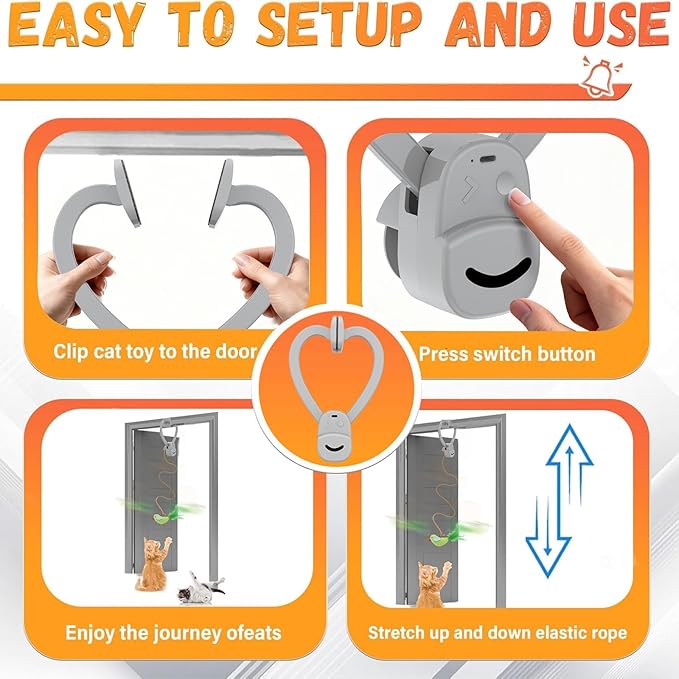 - Cat Doorway Toy Complete Set –Cat toys for doorway ready to Play Right Out of the Box Includes: ✅ 1x Flying bird Toy for Cats(attracts cats with realistic motion) ✅1x Mouse cat toy✅ 2x Elastic Strings (adjustable length for different play styles) ✅ 1x USB Charging Cable (convenient rechargeable) ✅ 1x Color Box + User Manual (easy setup)Enrichment for indoor cats perfect for keeping cats entertained automatic cat toy doorway.