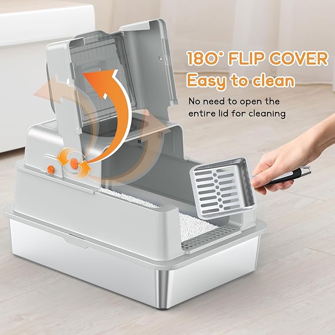 - Easy to Clean – Premium 304 Stainless Steel & Flip-Top Lid: The smooth, non-stick stainless steel litter box with lid resists sticking and staining. 180° flip-top design makes scooping and deep cleaning quick and easy, while the rust-resistant material ensures long-lasting performance.