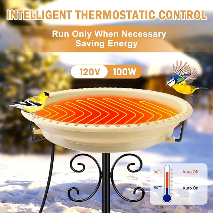 - 【100W Upgraded Heated Bird Bath】Newly upgraded 120V 100W winter heated bird bath can keep the birdbath from freezing in winter; Power is upgraded to 100W with higher thermal conductivity for rapid deicing and heating, ensuring your birds can enjoy warm, mild water in minutes; Allowing birds to play in warm water during the winter months