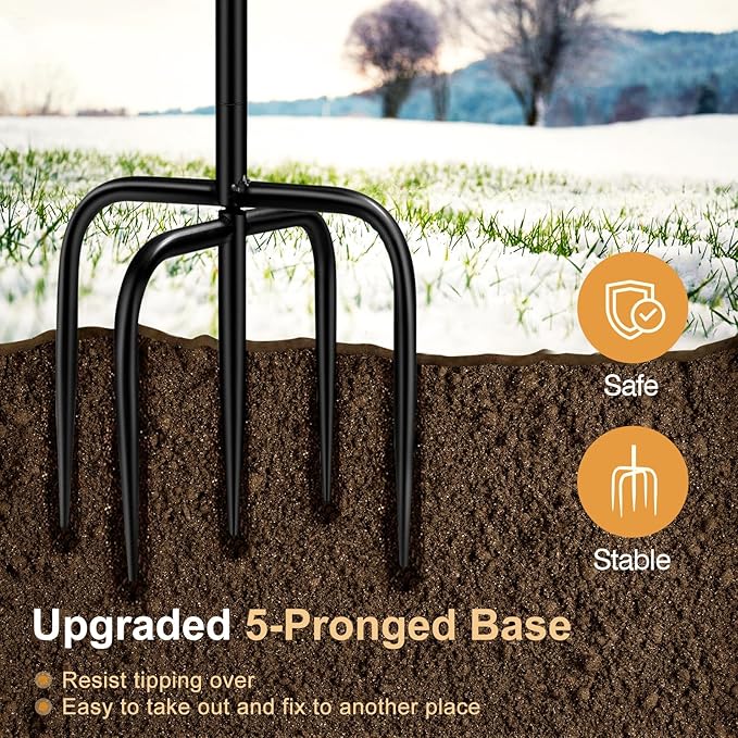 - 【Sturdy Metal 5-Pronged Base】Upgraded 5-forked base that resists tipping, adds more stability for this birdbath, make sure this heated birdbath stay in the soil of your garden upright and firmly; Heavy duty metal stake with black powder coat finish offers strong support for this bird bath, so that it is hard to bend, break or fracture