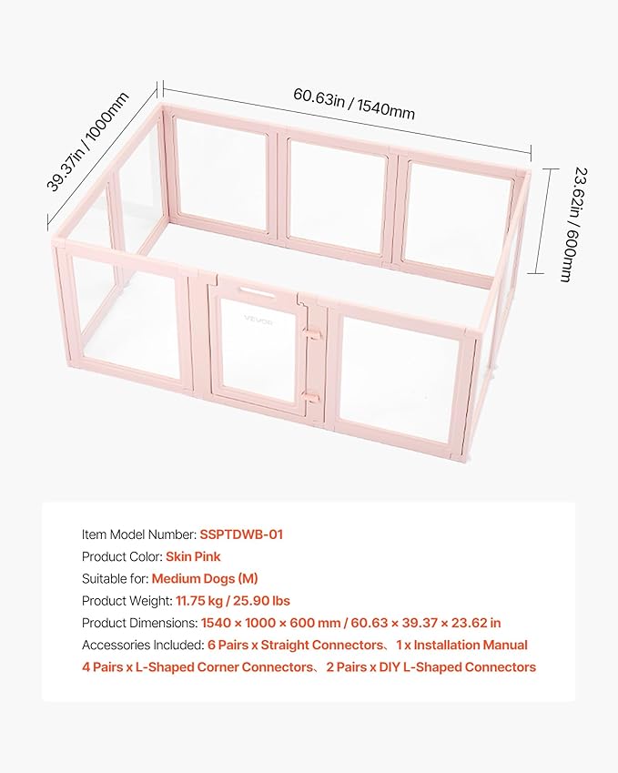 VEVOR Clear Acrylic Dog Playpen Indoor, 60x39x23 in Plastic Pet Playen for Medium Sized Dogs, Easy Assemble Waterproof Transparent Puppy Playpen, Easy to Clean, Durable Indoor Pet Dogs Cats Birth Kit