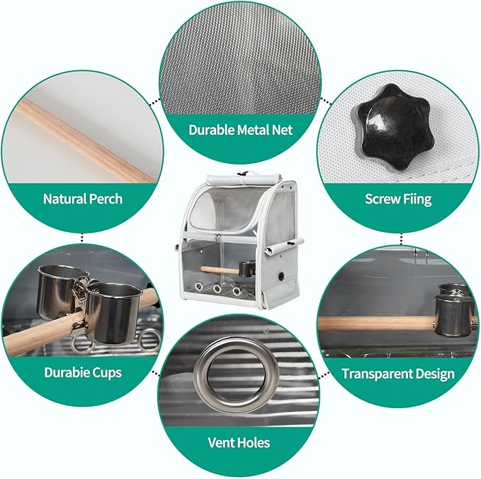 • 【COMPLETE ACCESSORY SET】A bird feeding cup, a standing perch(with fixed screws), a bottom plate, and a stainless steel mesh are included with this bird carrier travel cage. Prepare all the accessories for traveling, this all - in - one package ensures a comfortable and convenient journey for your feathered friend.
