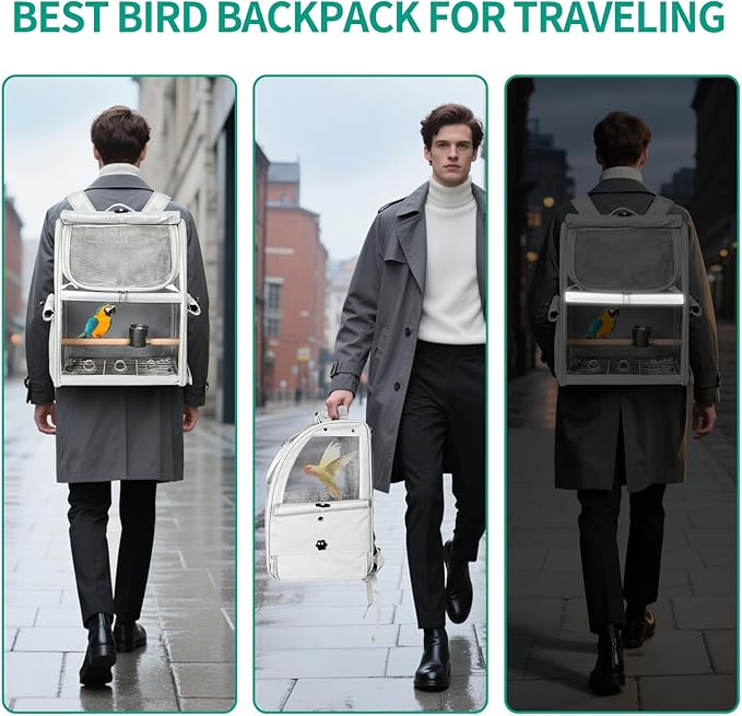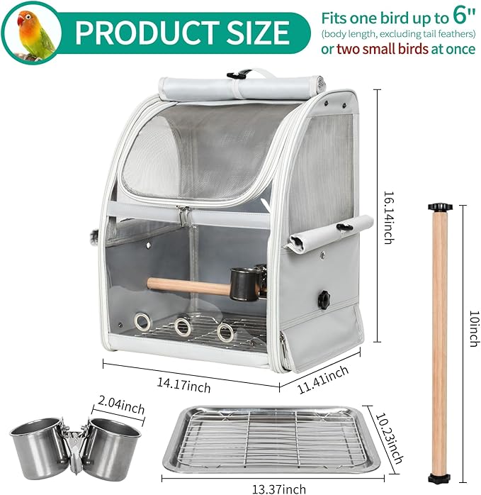 • 【IDEAL SIZE & COMPATIBILITY】Measuring 12.9" L x 10.4" W x 16.1" H, this bird carrier backpack serves as an ideal travel bird cage for most pet birds, suitable for Cockatiels, Conures, Quakers, Caciques, Mini Macaws, Parakeet, small Cockatoos, Lories, and other similar size parrots.