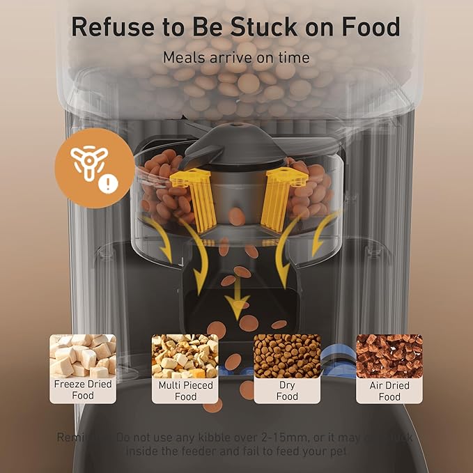 - 𝐉𝐚𝐦-𝐅𝐫𝐞𝐞 𝐃𝐞𝐬𝐢𝐠𝐧: Tired of clogged pet feeders? This automatic cat feeder is equipped with a high-performance rotor and uses smart reverse rotation technology to ensure smooth food flow, preventing any blockages. Whether used frequently or for extended periods, both you and your furry friend can enjoy peace of mind. Note: It supports kibble sizes ranging from 2-15mm