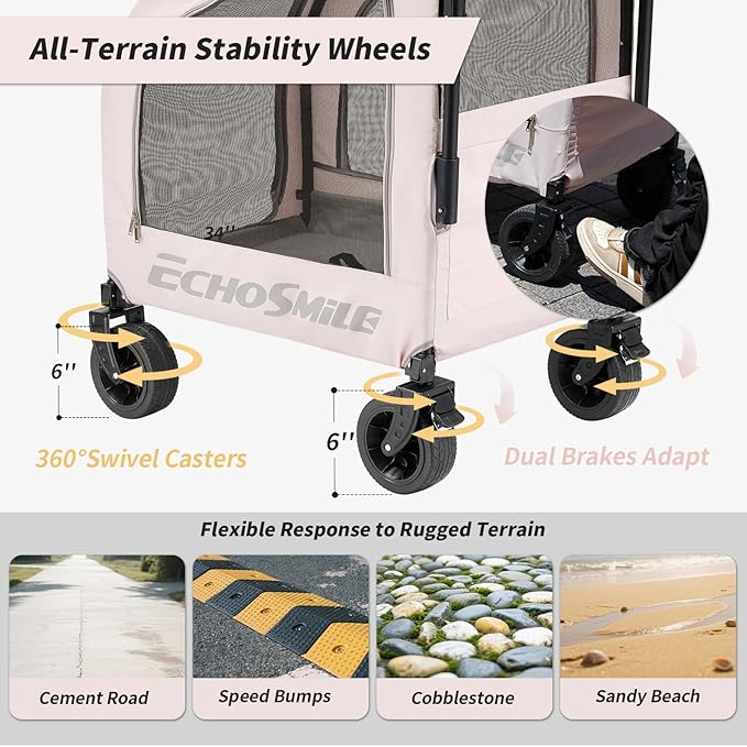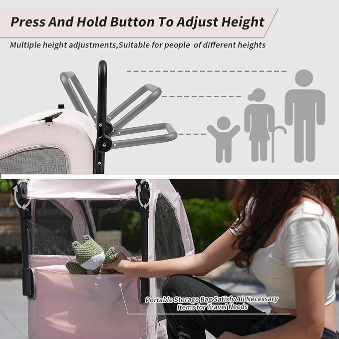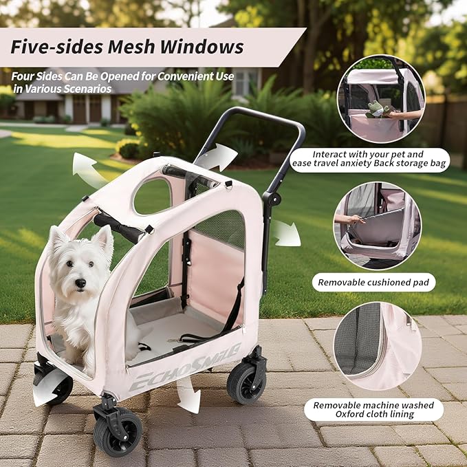 EchoSmile 4 Wheels Pet Stroller, Foldable Dog & Cat Stroller for All-Season, Lightweight Carrier with Storage Basket, Adjustable Handle, Removable Pad, Breathable Mesh, Up to 135 lbs, Pink
