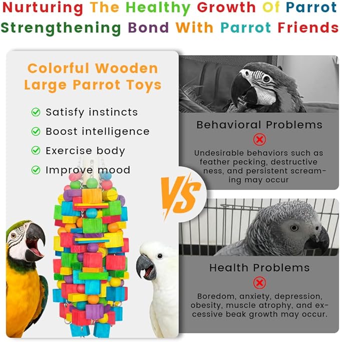 - Exercise The Parrot'S Beak: Natural wood helps parrots sharpen their beaks, consume energy, and relieve stress. The combination of different sizes of wood blocks brings a variety of touches and sounds, simulating the fun of foraging in the wild.Indestructible Stainless Steel Connections: Forget flimsy toys! The industrial-grade stainless steel chain is virtually impossible for even the most determined beaks to cut or break. The ultra-secure screw-in clasp ensures the toy stays firmly attached during the most energetic play sessions.