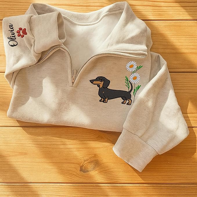 NAZENTI Embroidered Dachshund Sweatshirt with Dog Name on Sleeve, Personalized Valentines Dog Mom Shirt, Wiener Dog Gifts