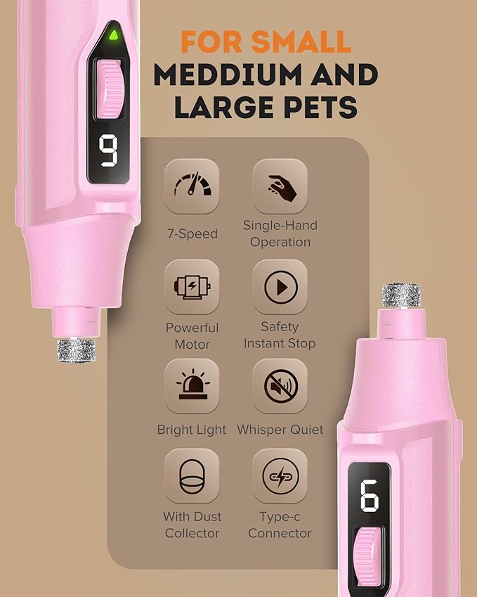 - INCLUDES DUST COLLECTOR: No more mess! The dog nail grinder features a built-in dust collector to keep nail filings contained, providing a tidy grooming session for both you and your pet