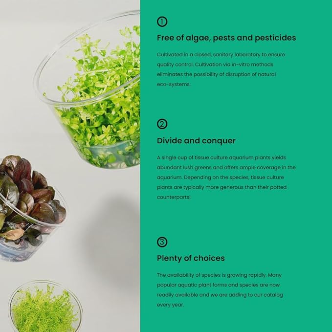 - Each cup ships as a clean tissue culture, free of snails and algae—ideal for aquarists wanting a pristine, pest-free start in community or shrimp tanks.