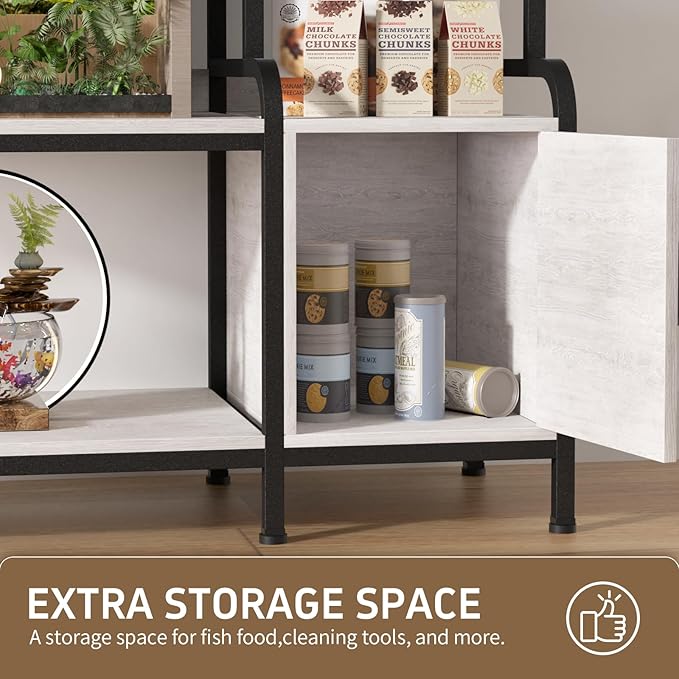 - 【All-in-One Aquarium Storage Cabinet】 This fish tank stand with a storage cabinet to neatly organizes all your aquarium supplies—fish food, water test kits, nets, and decor—in one sturdy rack. The classic brown finishseamlessly matches home décor while keeping the countertop tidy and items within easy reach.Perfect for aquarium hobbyists and reptile enthusiasts