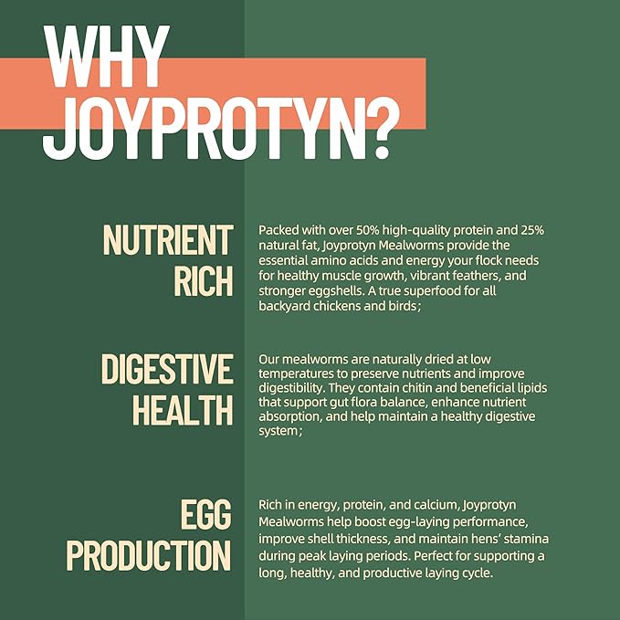 - 【Perfect for Poultry, Wild Birds & More】Loved by chickens, ducks, quails, bluebirds, robins, and even reptiles. Whether sprinkled as a treat, mixed with daily feed, or added to bird seed, Joyprotyn Mealworms are a high-energy superfood that keeps every beak happy.