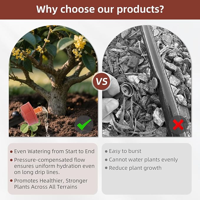 - Custom Flow Rates for Every Plant Type: Available in 0.25 GPH, 0.5 GPH, 0.75 GPH, 1 GPH, 2 GPH, 3 GPH and 4 GPH options. Choose low flow for delicate flowers, medium for vegetables, and higher flow for trees or shrubs. Optimize water delivery to each plant’s unique needs. !!! CHOOSE pressure-compensating drip irrigation emitters FROM 【Spalolen】!!!