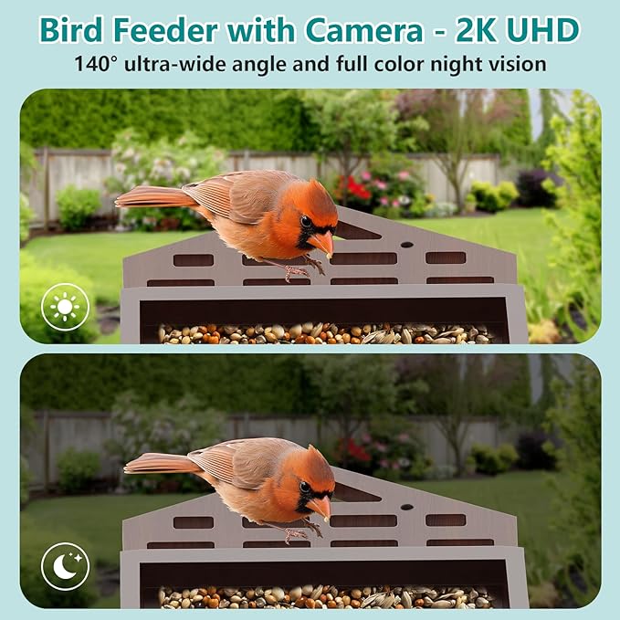 - Full Color Night Vision - Anti Squirrel Function: This smart bird feeder with camera has full-color night vision function. Whether it is day or night, this video bird feeder can provide you with clear bird videos. It is also equipped with dual channels, just speak into your phone, your voice will play live through the camera to gently deter squirrels. which can effectively prevent squirrels from approaching.