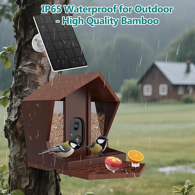 Smart Bird Feeder with Camera Solar Powered AI Identification 10,000+ Bird 2K UHD Video Live Instant Arrival Alerts and Real-Time Motion Detection Weatherproof Bamboo for Outdoor Birds Lovers