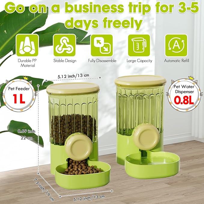 - 0.8L Pet Water Dispenser + 1L Pet Feeder - The auto gravity pet feeder and waterer set is fit for puppy, kitten, rabbit and small pets for 3-5 days when you are going on a short business trip.