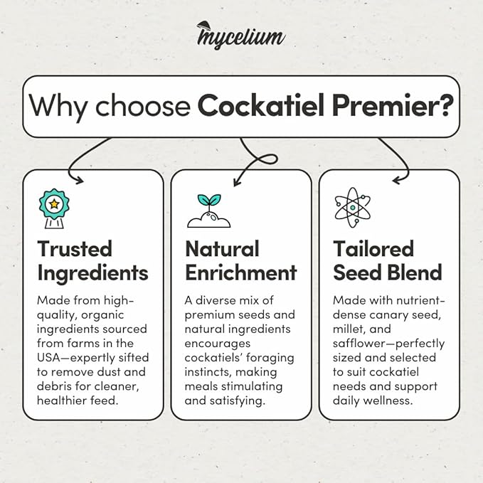 Mycelium Cockatiel Premier Bird Seed (5 LB Bag) | Organic Bird Food Fortified with Vitamins for Immunity, Energy & Digestion | Dust-Free, Daily Nutrition for Pet Birds | Non-GMO, USA Made