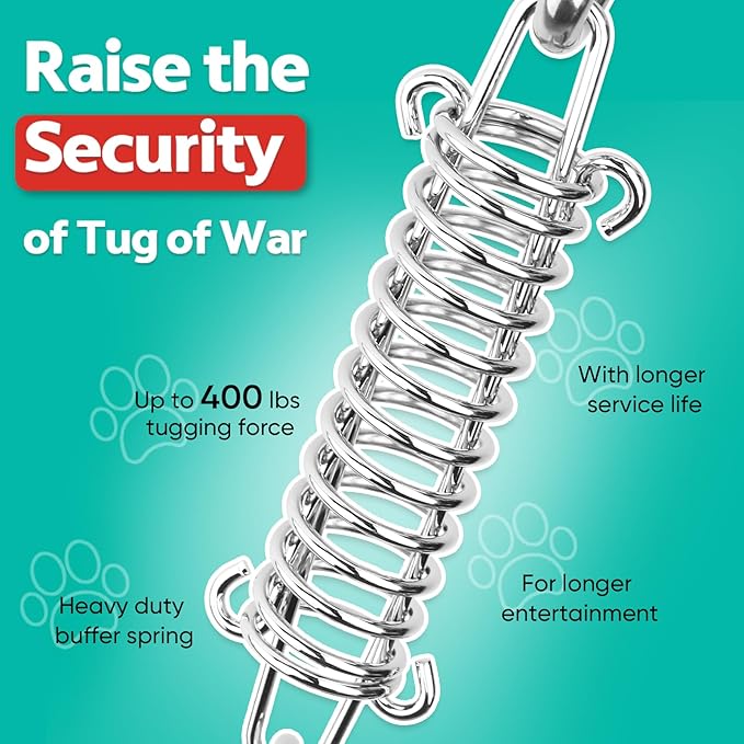 - Shock-Absorbing Spring for Safe Play – The stainless-steel spring acts like a cushion, absorbing shock to protect your dog’s teeth, neck and joints during intense tug sessions. Rust-resistant and weather-proof for all-season outdoor fun